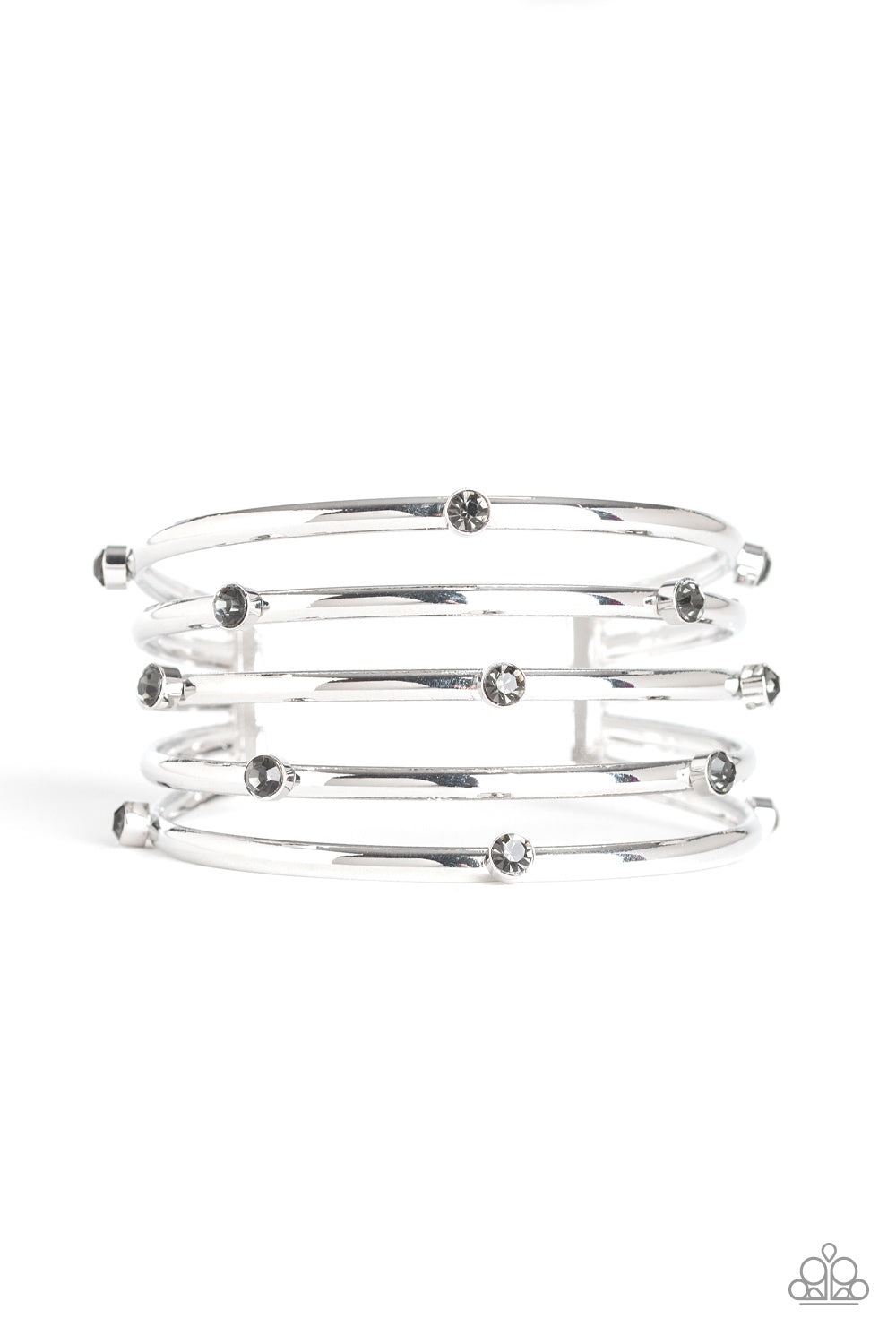 Sporadically dotted in smoky rhinestones, thick silver bars stack across the wrist, coalescing into a statement-making cuff.