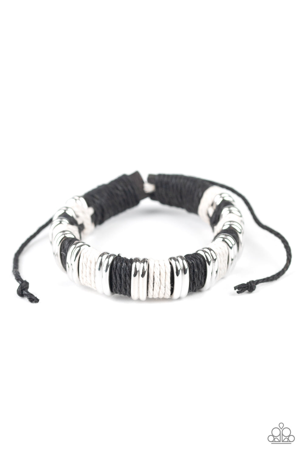 Infused with black and white twine, glistening silver accents are knotted in place along a leather band around the wrist for an edgy urban look. Features an adjustable sliding knot closure.